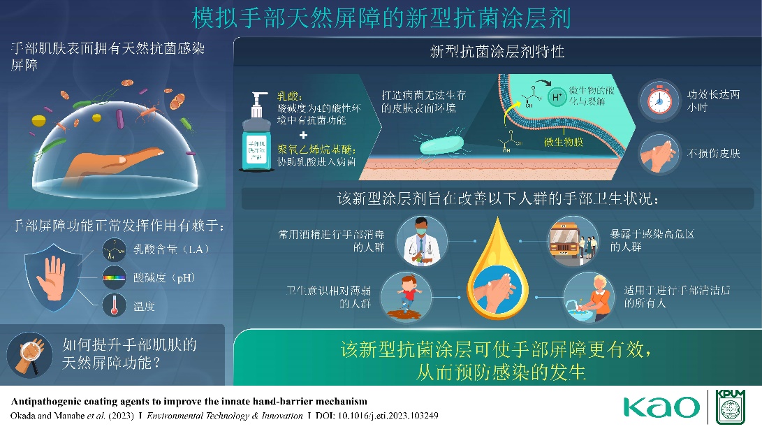 花王株式会社(社长:长谷部佳宏)个人护理研究所、生物科学研究所、分析科学研究所,与京都府立医科大学大学院医学研究科的广濑亮平助教等组成的研究团队,通过模仿手部天然“抗菌屏障功能(手部屏障)*1”的作用机制,成功开发了能使人体这一抗菌、抗病毒功能持续高效,且对手部肌肤无负担的技术。在现在的手部清洁习惯基础上运用该技术,有望在医疗场景下及日常生活中降低无形中产生的接触感染的风险。