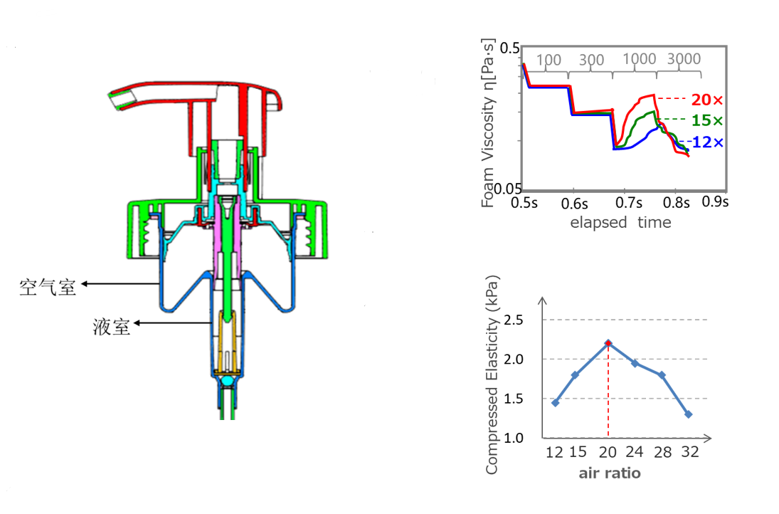 如今市面上广泛应用的泡沫泵头气液比以12倍、13倍、15倍为主,包装容器团队思考继续提升气液比倍数的可能性。然而,一味提升气液比会导致空气室内气体过多,消费者在使用时受到压强的阻碍难以按下泵头,而继续扩大空气室又会影响产品的使用和美观。如何平衡气液比和按压感受是包装容器团队遇到的第一个课题。